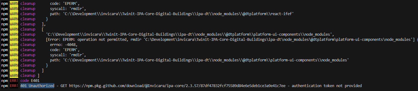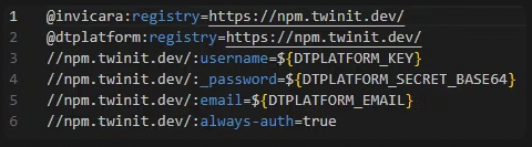 If you have ensured that your .npmrc file is correct and located in the same folder as your package.json file, and that your environment variables have been correctly configured based on your Twinit production user account, the error may exist in your package-lock.json file. Since npm will not override a repository specified in the package-lock.json file, it's possible that if a package-lock.json was provided to you, that it may have references to the wrong npm repository for the Twinit libraries.