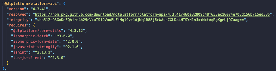 To check if this is the case, open your package-lock.json file. Once opened, search for a Twinit npm library such as @dtplatform/platform-api or the library that appears in your error message. If the resolved path starts with anything other than https://npm.twinit.dev/ (such as shown in the above image), then the problem is your package-lock.json file. You can resolve this by deleting your package-lock.json file and running npm install again.